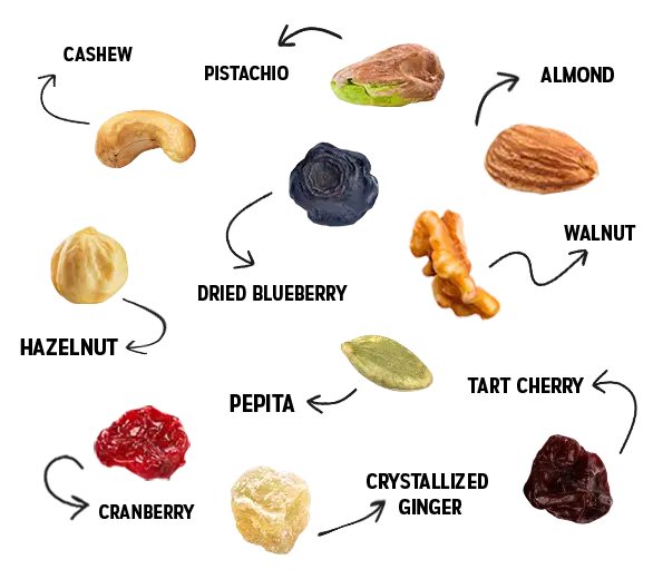 Sweetened Dried Cranberries (Cranberries, Sugar, Sunflower Oil), Walnuts, Pepitas, Roasted Cashews (Cashews, Peanut Oil), Dry Roasted Hazelnuts, Dry Roasted Almonds, Sweetened Dried Cherries (Cherries, Sugar, Sunflower Oil), Dried Gingers (Gingers, Sugar, Sodium Dioxide [Preservative]), Sunflower Oil, Amla Fruit Extract (Vitamin C), Elderberry Extract, Zinc Citrate, Microencapsulated Probiotic Lactobacillus Rhamnosus GG, Algae Sourced Cholecalciferol(Vitamin D3).