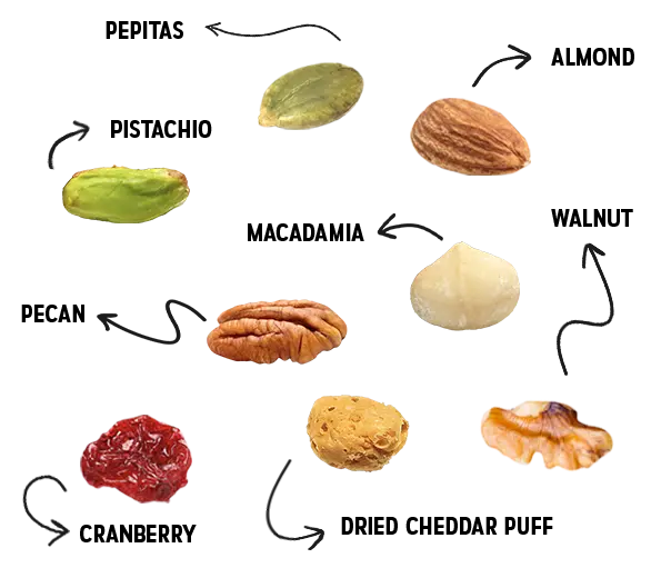 Roasted Almonds (Almonds, Peanut Oil), Roasted Pumpkin Seeds (Pumpkin Seeds, Sunflower Oil), Pecans, Dried Cheddar Cheese (Pasteurized Cow's Milk, Rennet, Salt, Culture, Calcium Chloride (Stabilizer), Beta Carotene [Colorant), Potassium Sorbate [Preservative]), Dry Roasted Macadamia Nuts, Sunflower Oil, Microencapsulated Probiotic Lactobacillus Rhamnosus GG.